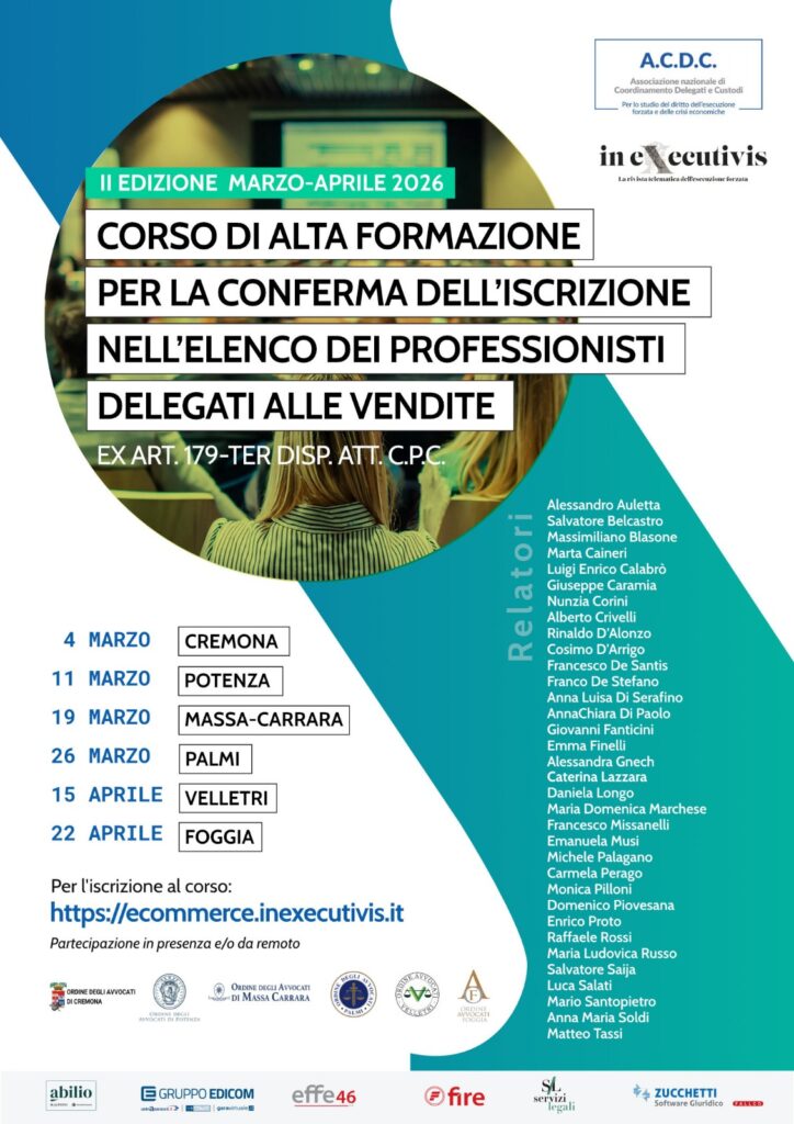 ACDC Nazionale e Inexecutivis.it, con l’impegno delle Associazioni locali indicate, ha organizzato il corso di formazione per la conferma nell’elenco dei professionisti delegati e custodi giudiziari ex art. 179 ter disp. att. c.p.c. Iscrizioni dal sito inexecutivis.it.