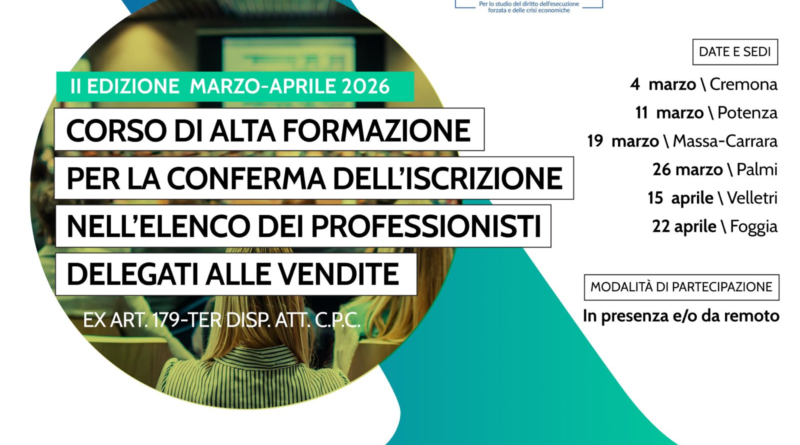 ACDC Nazionale e Inexecutivis.it, con l’impegno delle Associazioni locali indicate, ha organizzato il corso di formazione per la conferma nell’elenco dei professionisti delegati e custodi giudiziari ex art. 179 ter disp. att. c.p.c. Iscrizioni dal sito inexecutivis.it.