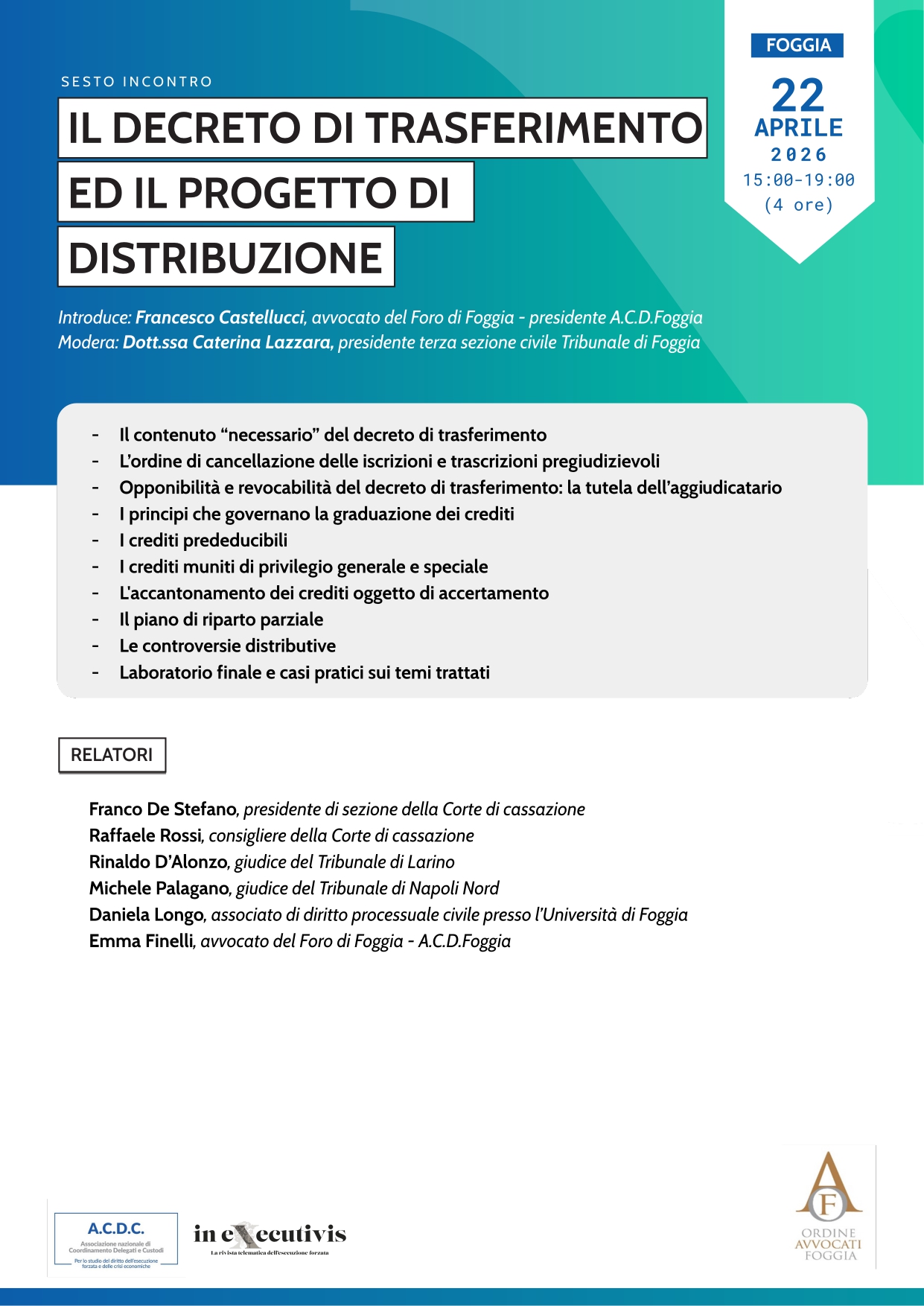 Foggia – Corso di formazione ex art. 179 ter disp. att. c.p.c. – sesta sessione