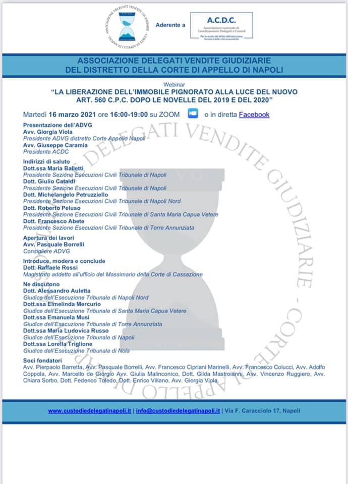 Webinar Associazione Delegati Vendite Giudiziarie Distretto Della Corte D’Appello di Napoli – 16 marzo 2021 – La liberazione dell’immobile pignorato alla luce del nuovo art. 560 c.p.c. dopo le novelle del 2019 e 2020 da | | EVENTI | 0 commenti Please follow and like us: Invia commento Annulla rispostaIl tuo indirizzo email non sarà pubblicato. I campi obbligatori sono contrassegnati *Commento * Nome * Email * Sito web Salva il mio nome, email e sito web in questo browser per la prossima volta che commento. Δ
